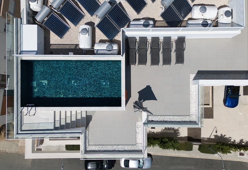 Budynek posiada windę na wszystkie piętra, w tym na dach z basenem i panoramicznym widokiem na Pafos.