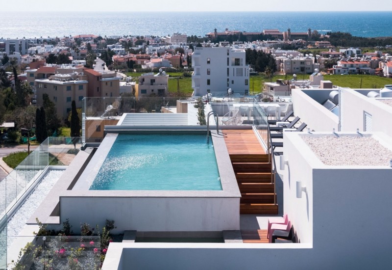 Doświadcz przywileju korzystania z ogrodu na dachu z basenem, który oferuje luksusową przestrzeń wypoczynkową z zapierającymi dech w piersiach panoramicznymi widokami na lśniące morze.