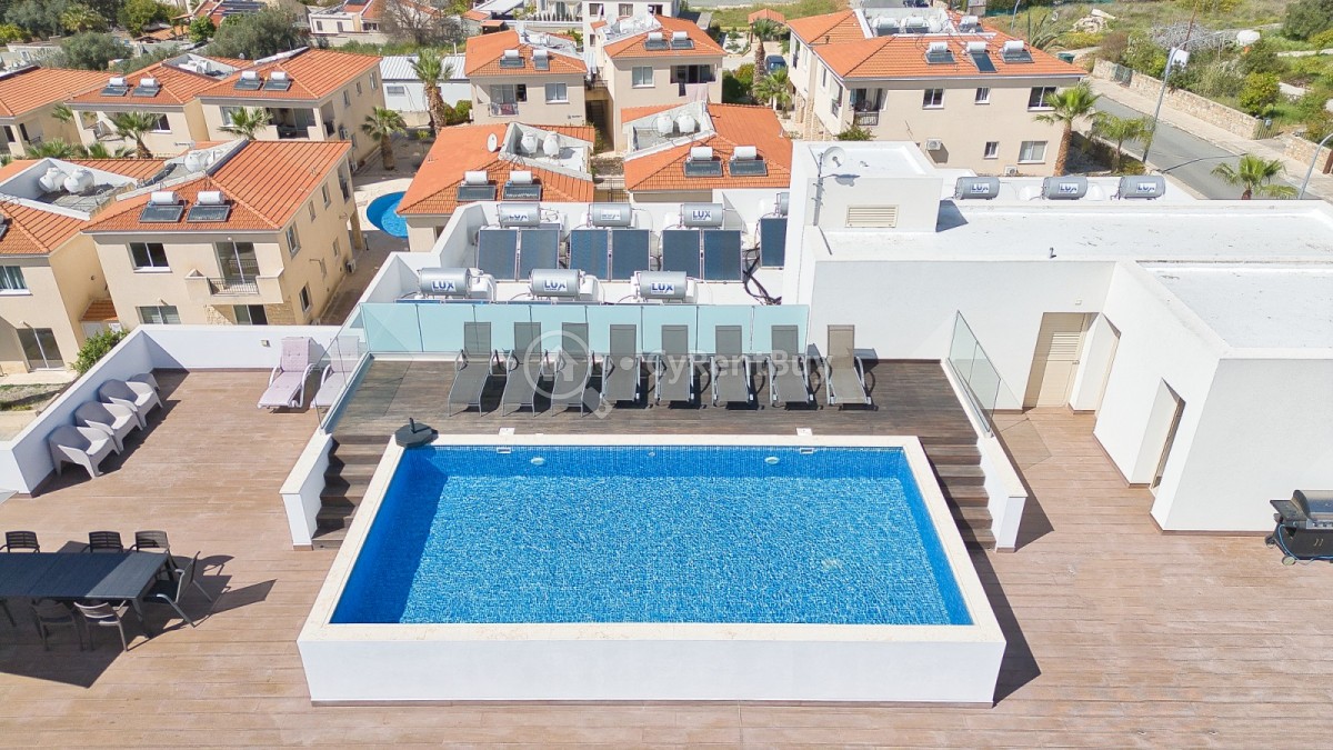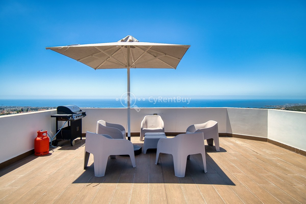 Na dachu znajduje się duży basen, miejsce do grillowania i panoramiczne widoki – idealne do relaksu lub spotkań towarzyskich nad morzem.