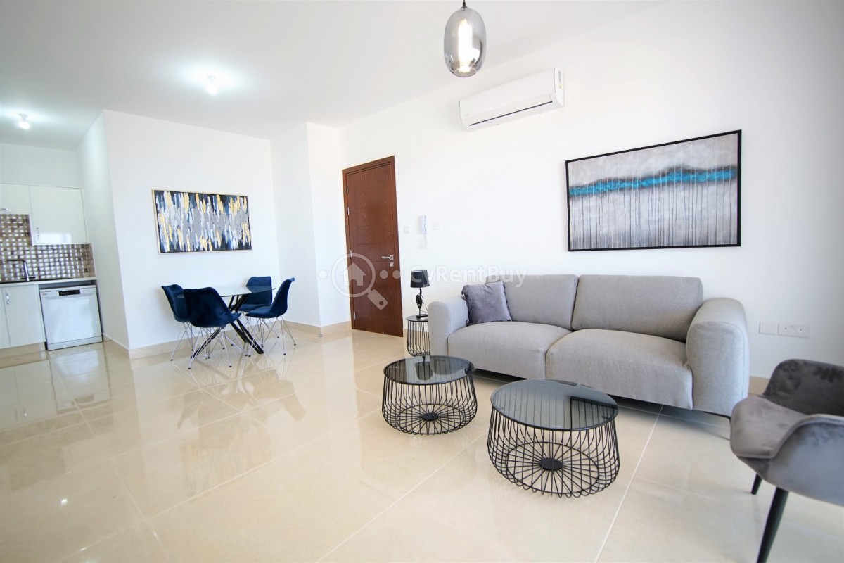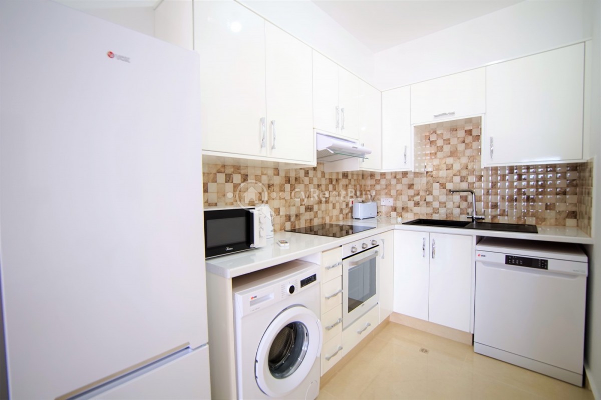 The bright living area flows seamlessly into the open kitchen, fully equipped with everything you need, including a fridge, oven, dishwasher, and more.