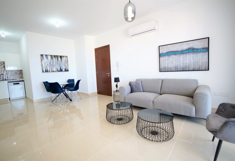 The bright living area flows seamlessly into the open kitchen, fully equipped with everything you need, including a fridge, oven, dishwasher, and more.