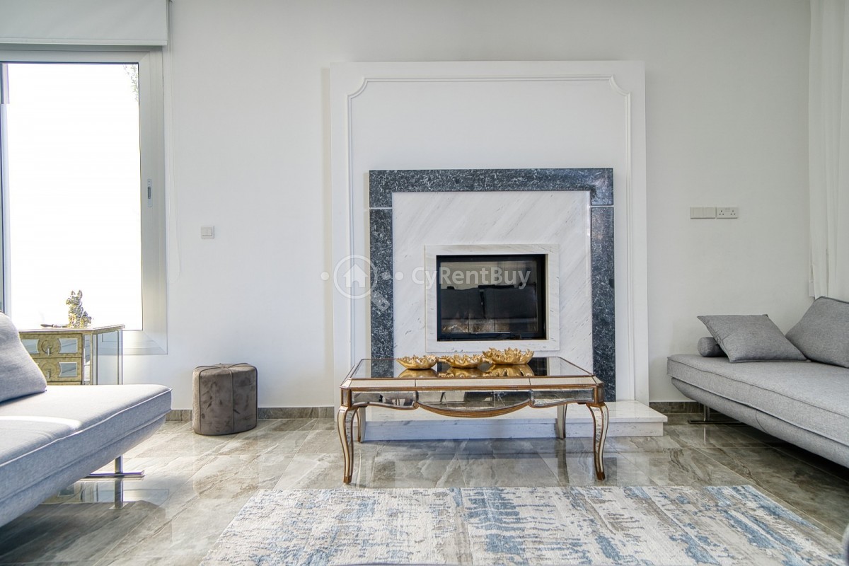 Rozległa, otwarta przestrzeń dzienna charakteryzuje się nowoczesną, białą kuchnią z wysokiej jakości sprzętem i przytulnym kominkiem, tworząc płynne połączenie stylu i komfortu.