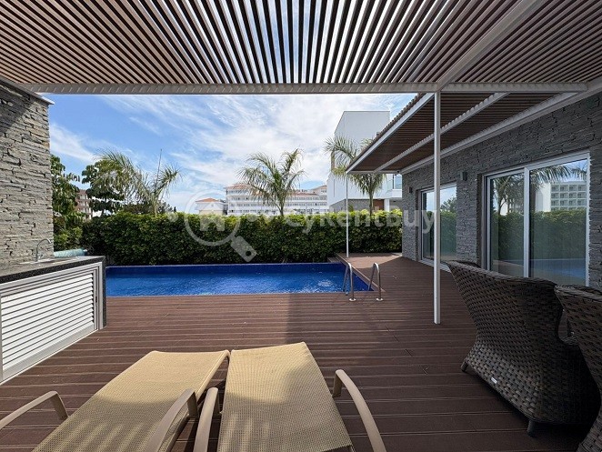 Designed for refined living, the villa features generous interiors with seven spacious bedrooms, multiple en-suite and family bathrooms, and beautifully appointed living areas. Expansive verandas, a private roof terrace, and a large swimming pool create seamless indoor-outdoor living, complemented by stunning sea and town views.