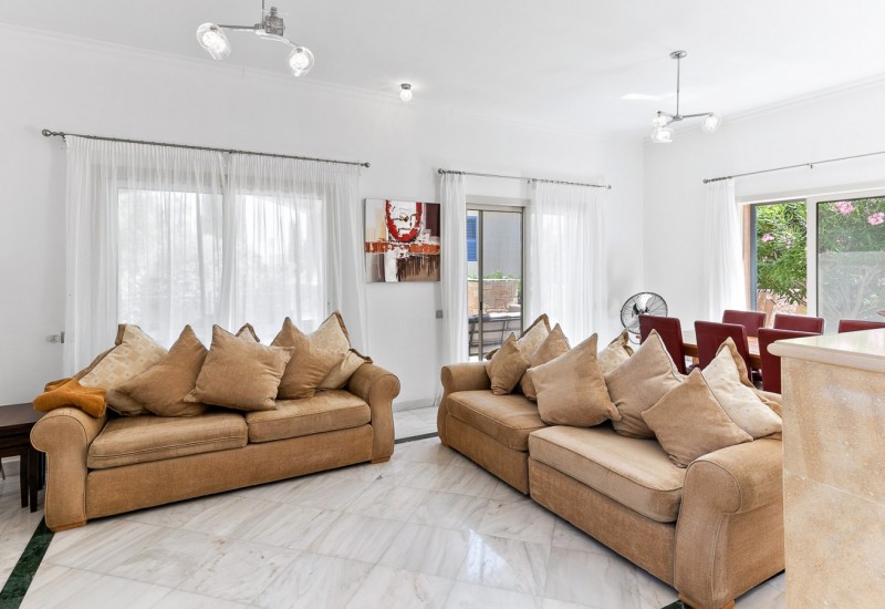 Wchodząc do willi, wita nas luksusowa marmurowa podłoga. Salon i jadalnia wyposażone w duże przeszklone drzwi wychodzą na podwyższony taras ze szklanymi balustradami, skąd roztacza się widok na basen i ogród. W salonie znajduje się także funkcjonalny kominek z marmurowym obramowaniem. Kuchnia jest w pełni wyposażona w nowoczesne sprzęty, a na tym poziomie znajduje się także toaleta dla gości.