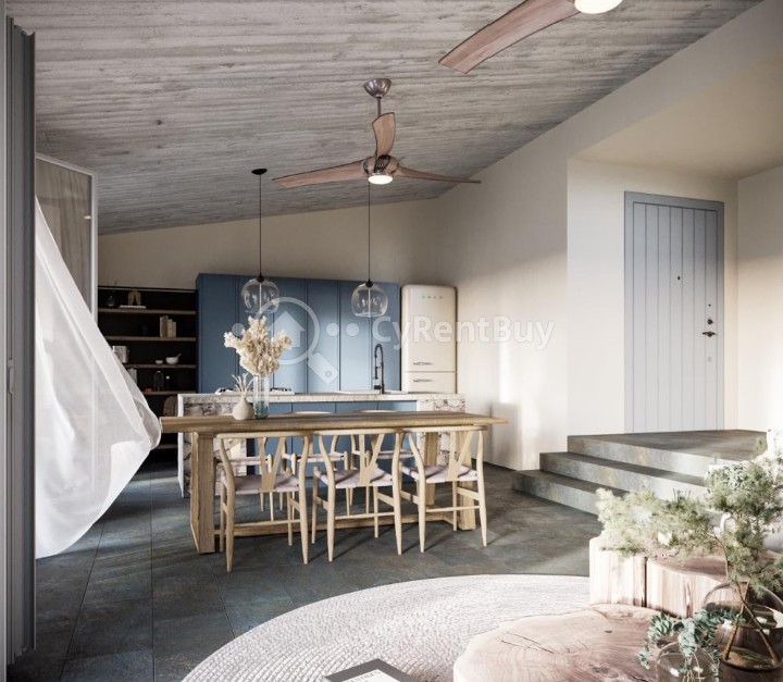 Otwarta kuchnia bezbłędnie łączy się z salonem, tworząc harmonijną przestrzeń.