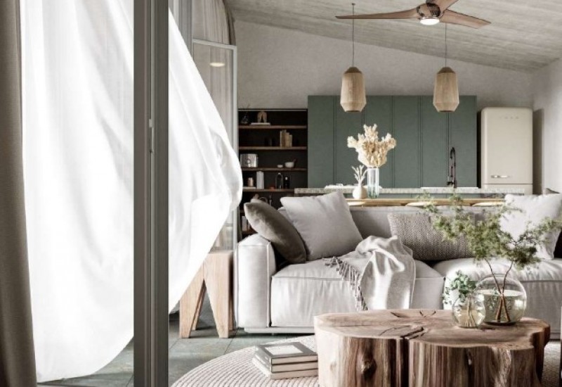 Otwarta kuchnia bezbłędnie łączy się z salonem, tworząc harmonijną przestrzeń.
