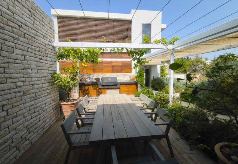 Nowoczesna kuchnia płynnie przechodzi na duży taras otaczający prywatny basen, idealny do relaksu, spotkań towarzyskich i posiłków na świeżym powietrzu.