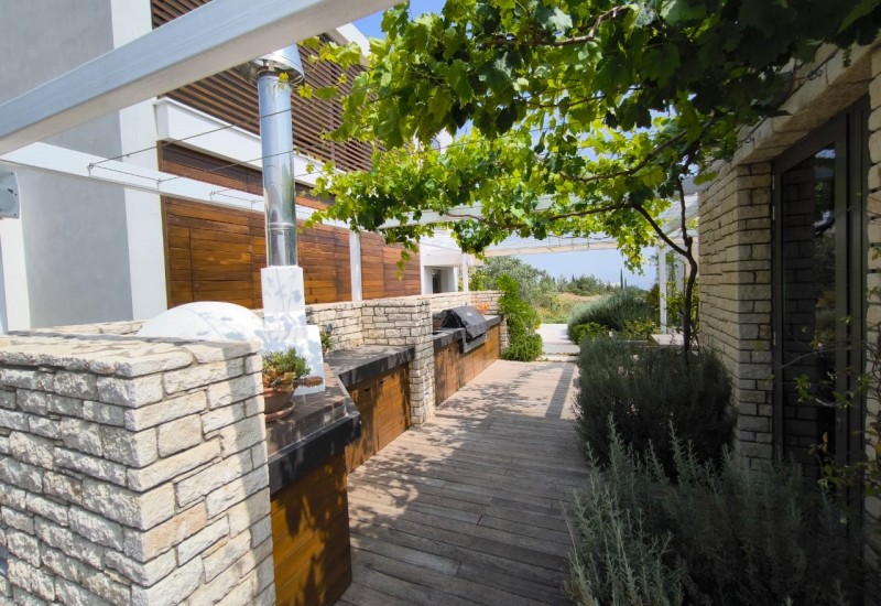 Nowoczesna kuchnia płynnie przechodzi na duży taras otaczający prywatny basen, idealny do relaksu, spotkań towarzyskich i posiłków na świeżym powietrzu.
