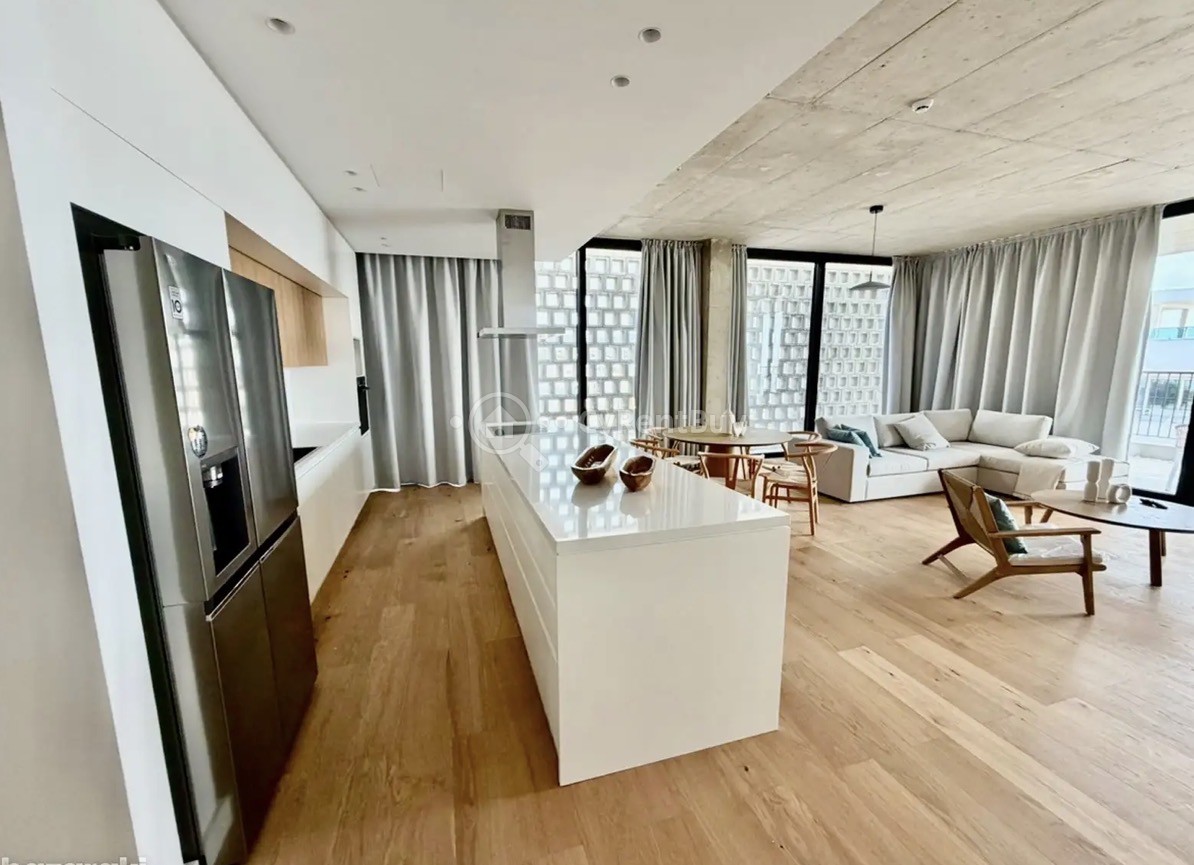 The apartment features a generous open-plan living, dining, and kitchen area, centered around a striking designer island. Premium finishes, natural materials, and full-height sliding glass doors create a seamless connection to the large covered verandas, perfectly framing the city skyline and Mediterranean Sea.