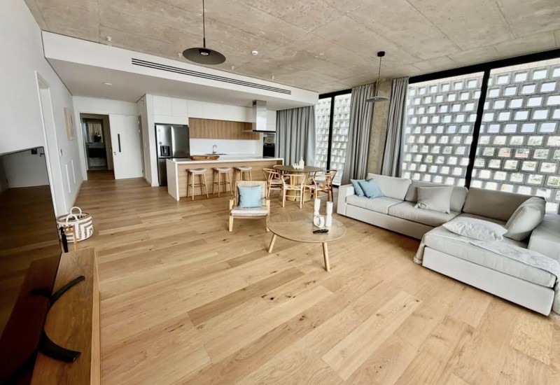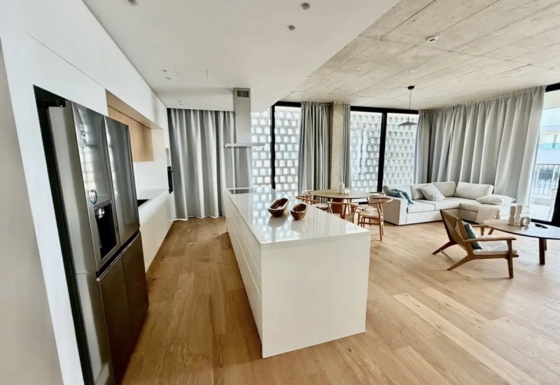 The apartment features a generous open-plan living, dining, and kitchen area, centered around a striking designer island. Premium finishes, natural materials, and full-height sliding glass doors create a seamless connection to the large covered verandas, perfectly framing the city skyline and Mediterranean Sea.